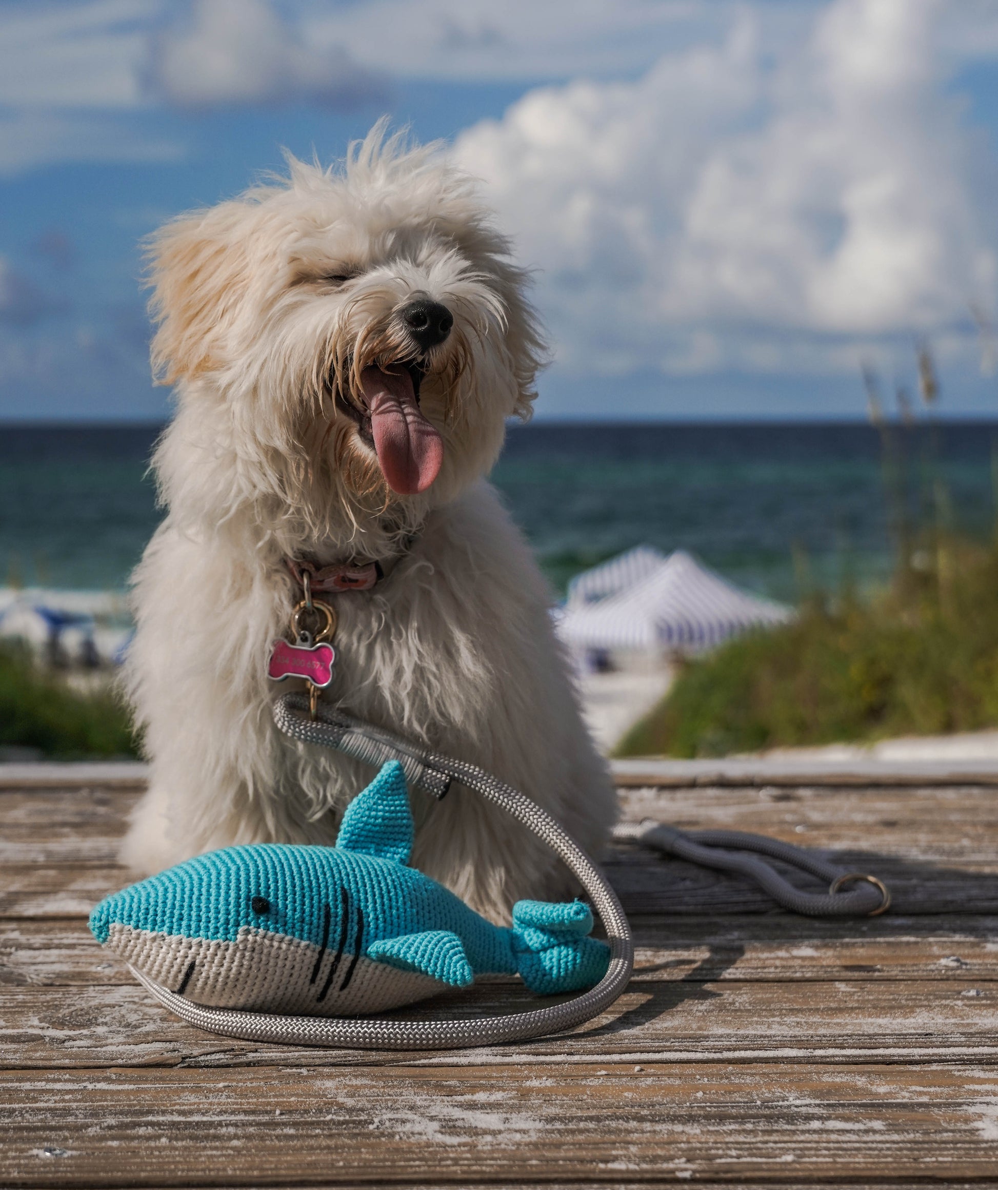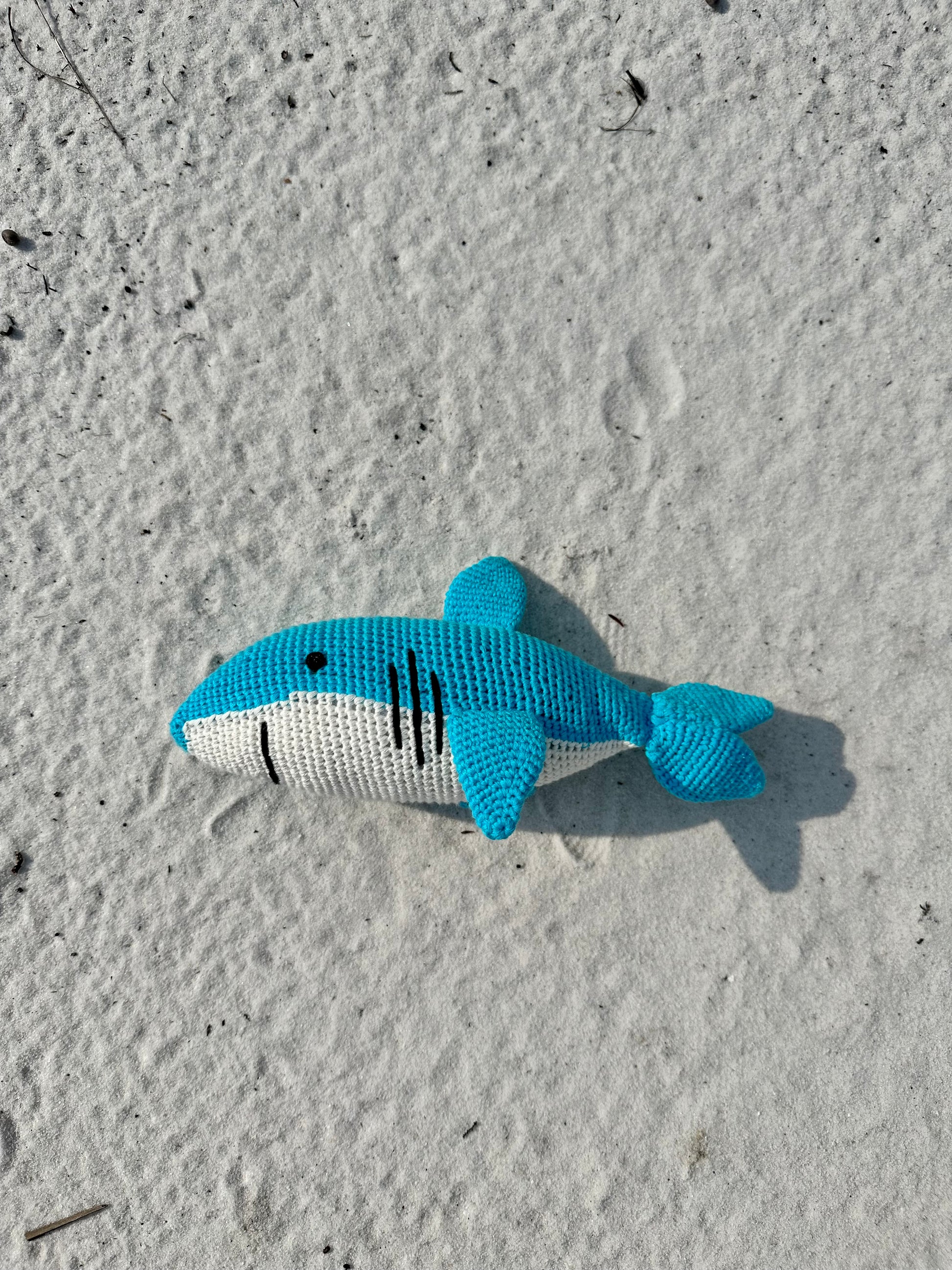 Sammy the Shark, crafted from 100% organic crochet cotton, offers a dental-friendly play experience. This 10-inch toy, featuring a delightful squeaker, ensures hours of fun for dogs weighing 1 to 100 lbs. Enhance your pup's playtime with this eco-friendly, one of a kind shark toy.