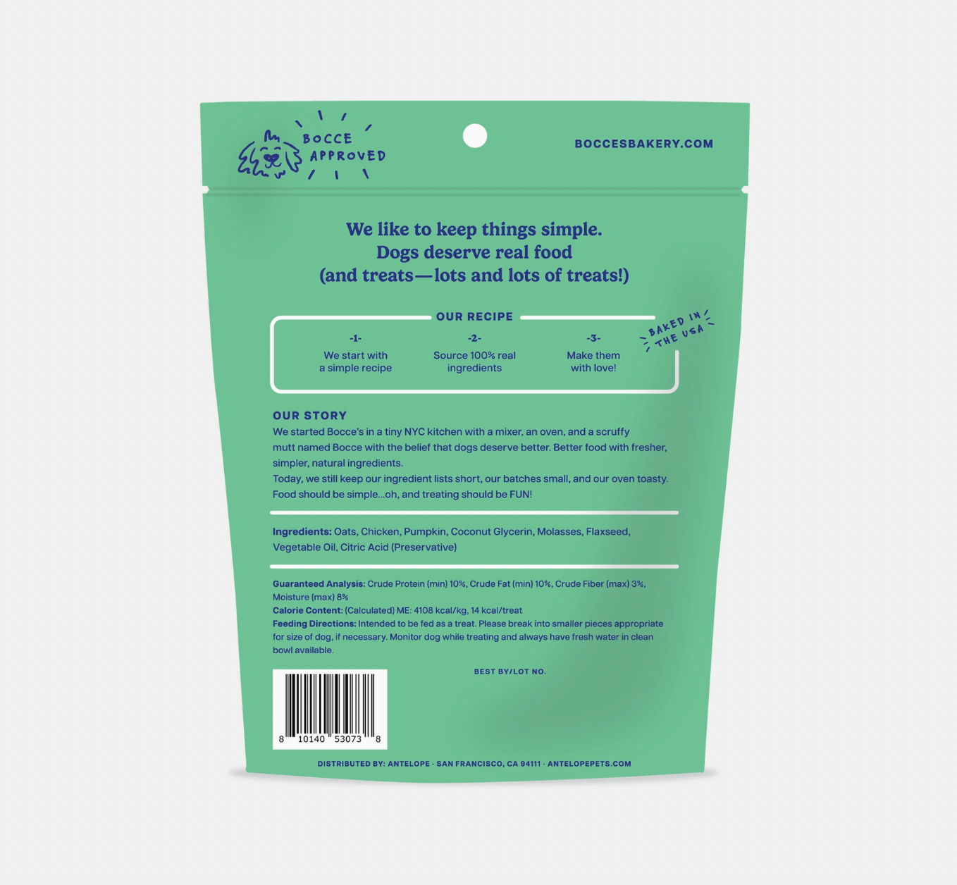 Ingredients: Oats, Peanut Butter, Carob, Vanilla, Coconut Glycerin, Cane Molasses, Flaxseed, Vegetable Oil, Citric Acid (Preservative) Guaranteed Analysis: Crude Protein (min) 10%, Crude Fat (min) 11%, Crude Fiber (max) 3%, Moisture (max) 8% Calories: 14 cal/treat