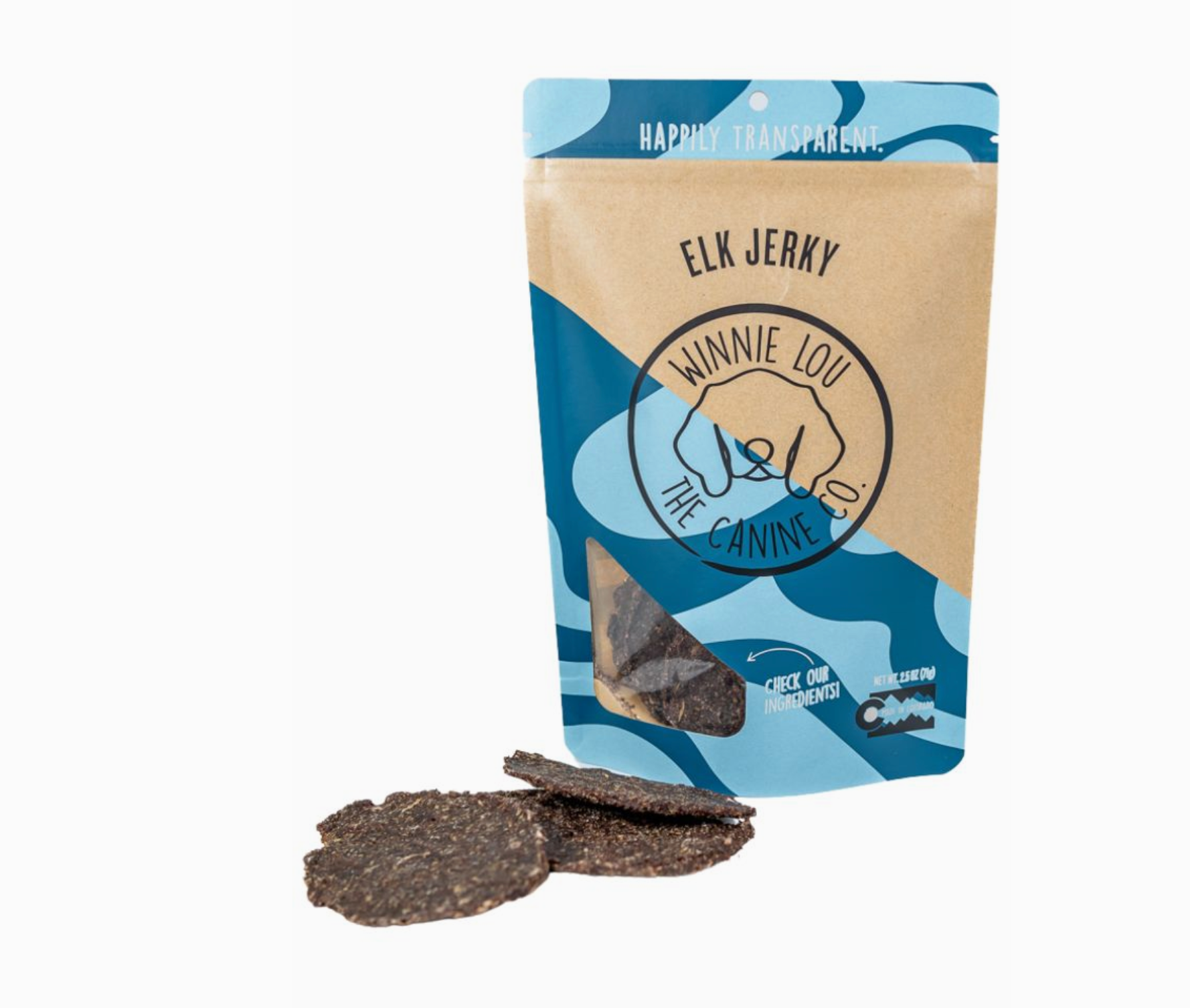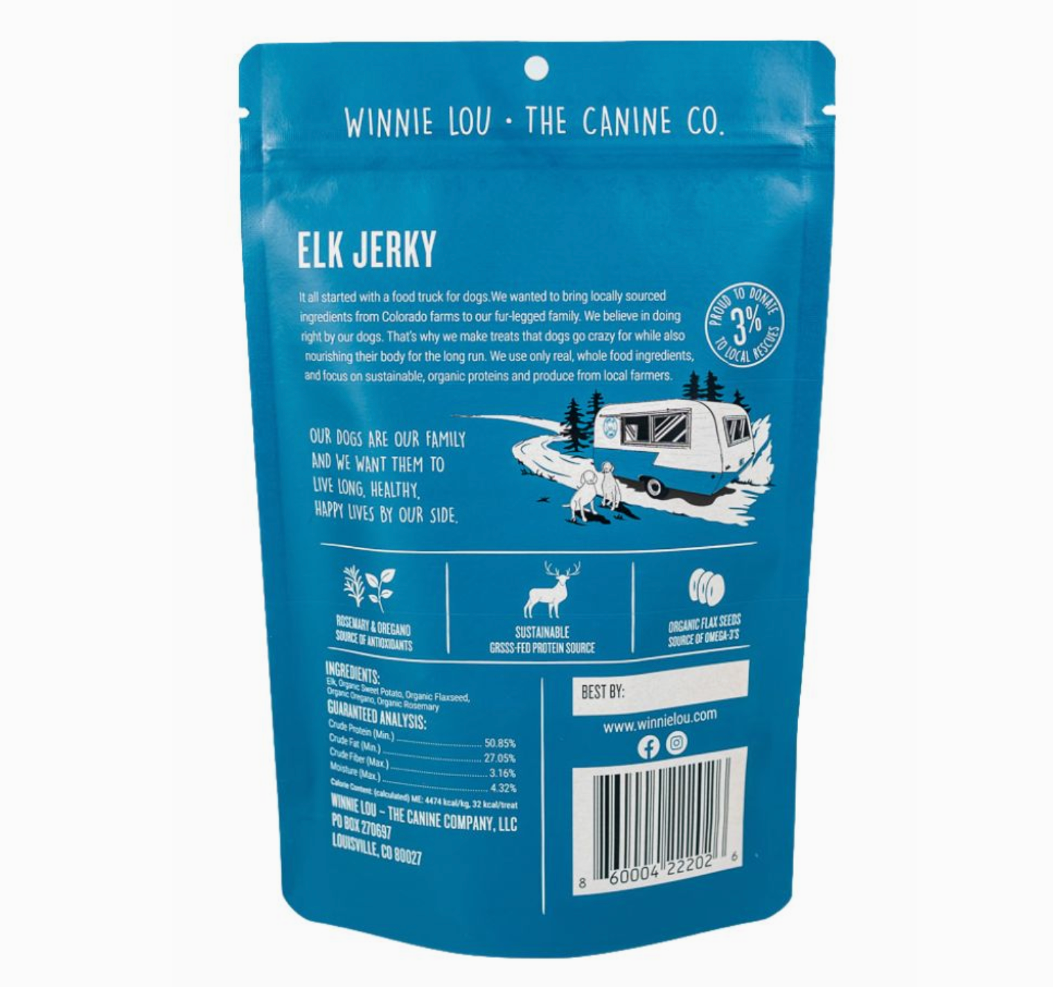 Crafted with over 1/2 pound of grass-fed elk jerky in each bag. Elk is sourced locally in the midwest. This is a great, lean protein, that rarely are allergens to pups.